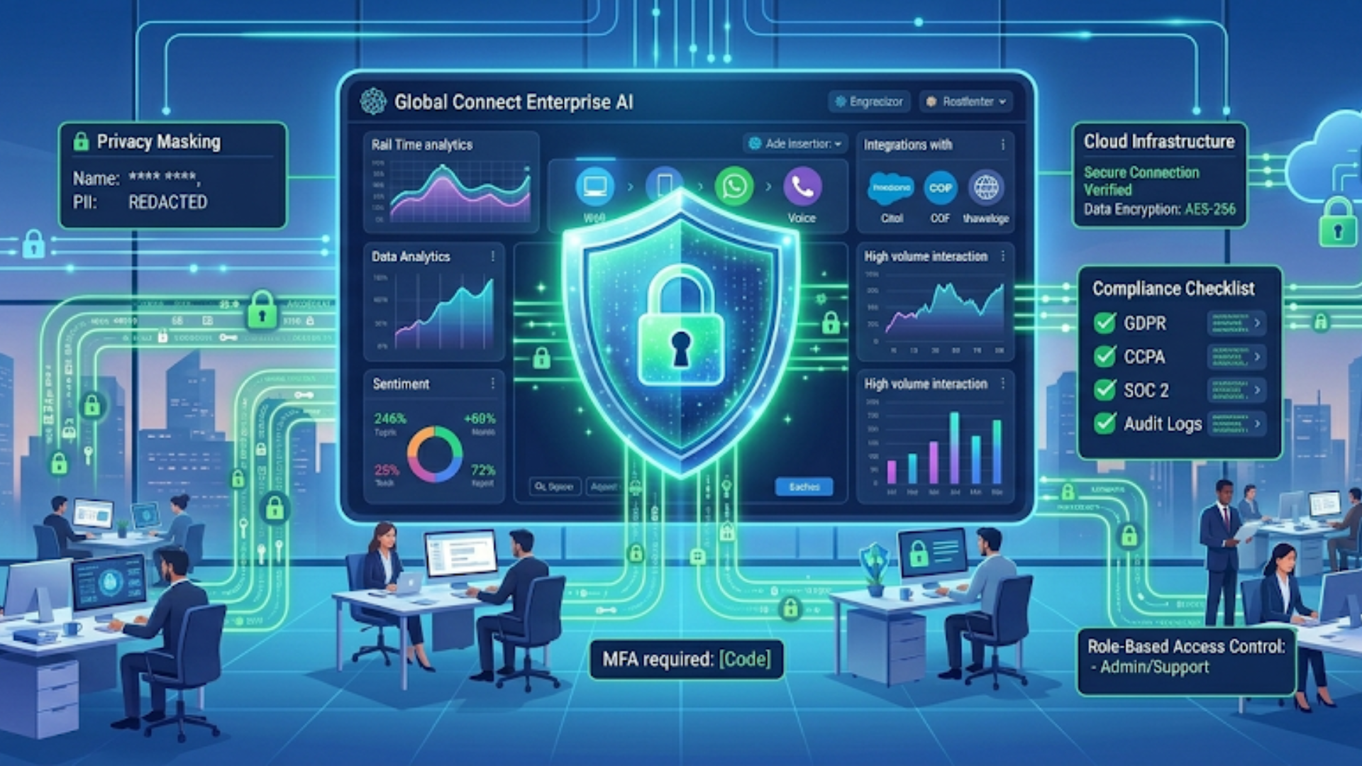 - Omnichannel support across web chat, mobile app, SMS, WhatsApp, and voice