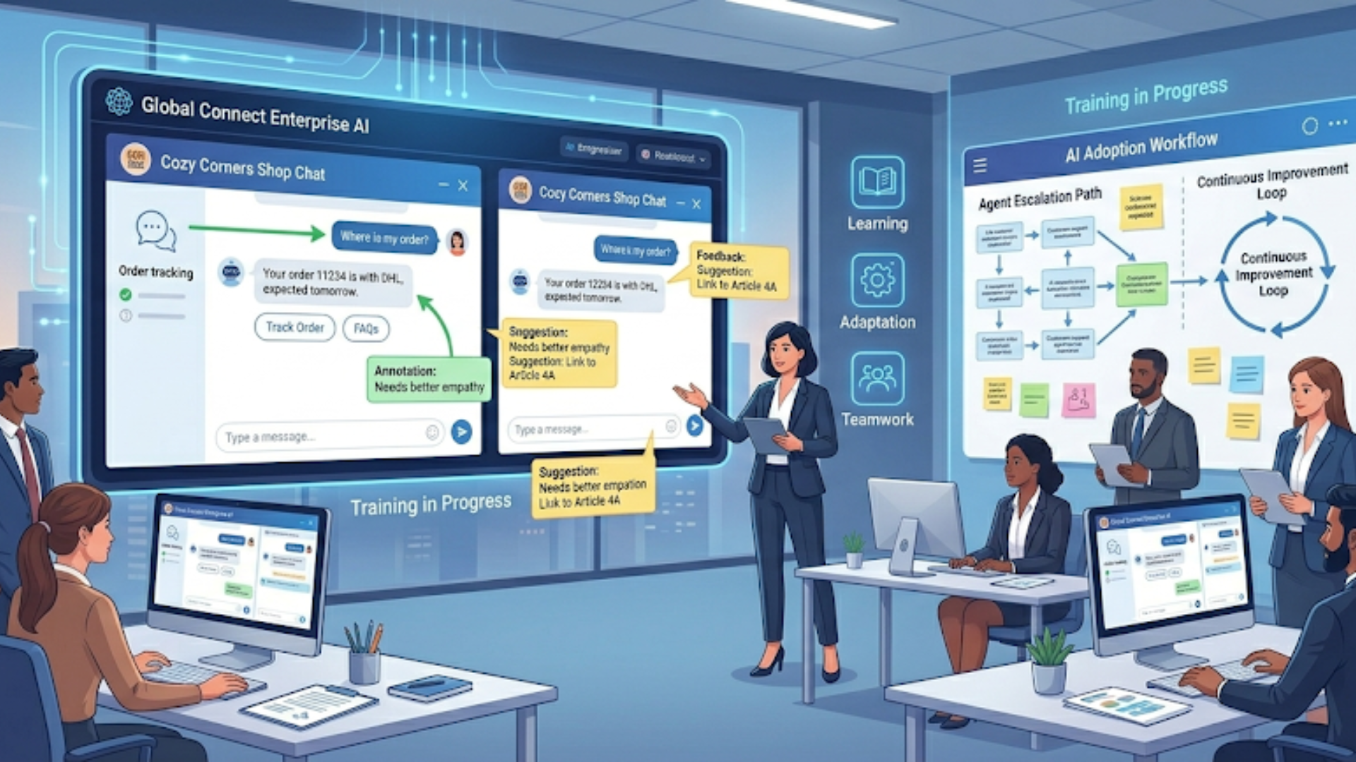 - Shadow sessions where agents watch bot conversations and annotate improvements